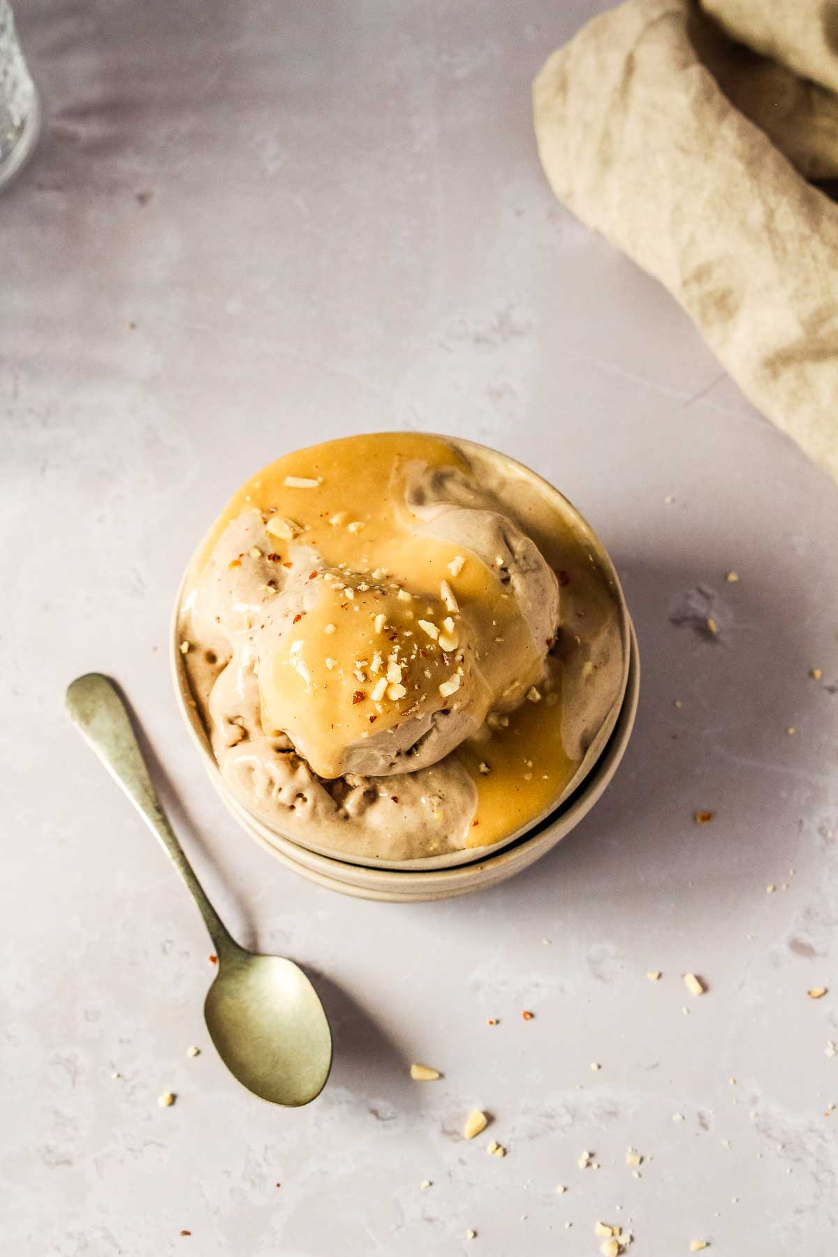Whether you seek a healthier dessert or crave a creamy delight, this recipe will satisfy your cravings. Serve the peanut butter nice cream with my thick vegan caramel sauce for the ultimate indulgence.