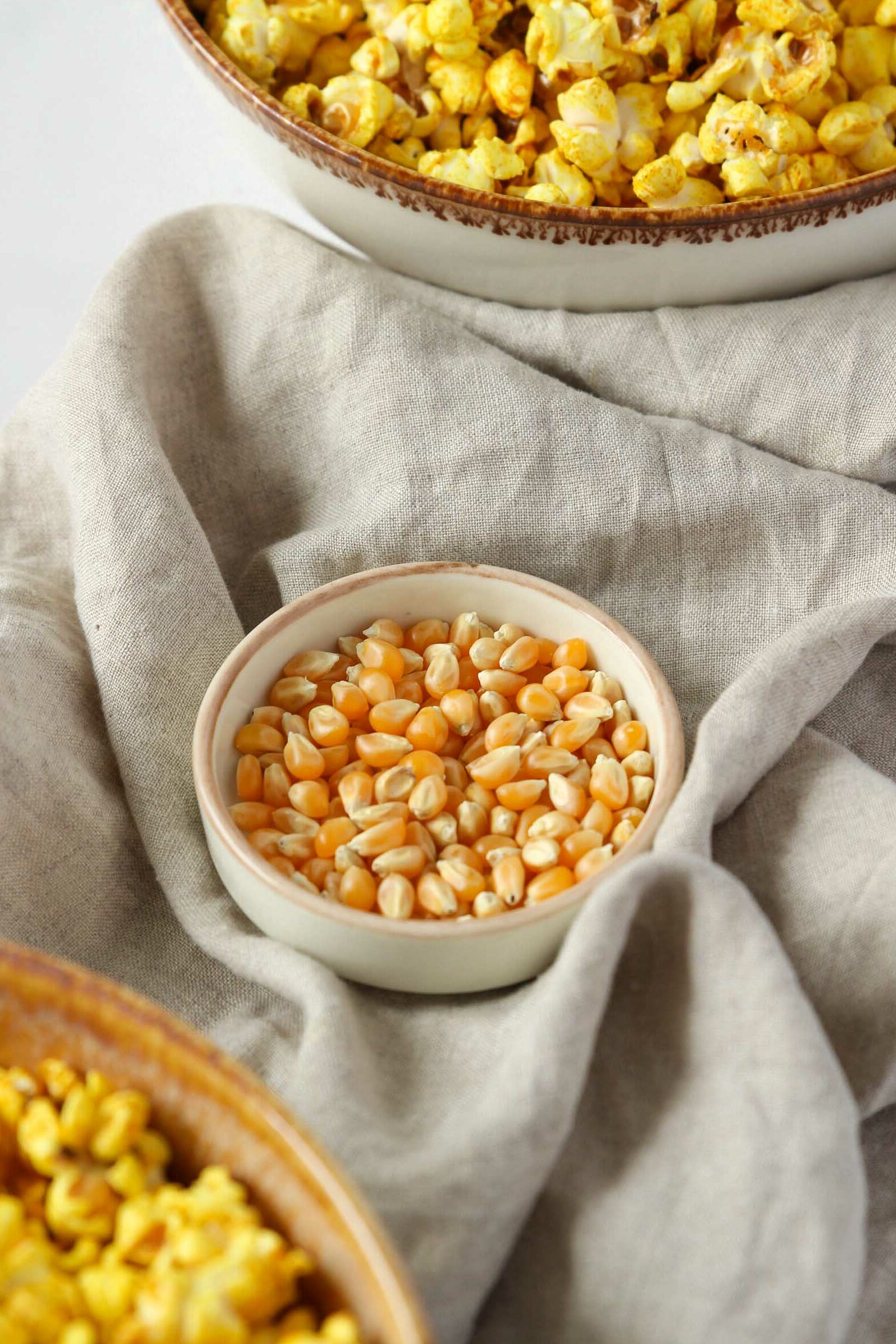 Spicy, crunchy and full of curry flavour! This easy popcorn recipe is a flavourful twist on classic movie popcorn. Curry, turmeric, cayenne and salt are combined with vegetable oil to create a flavourful seasoning. After making the popcorn, it is mixed with the seasoning and transformed into an aromatic and vegan treat you can’t get enough of.